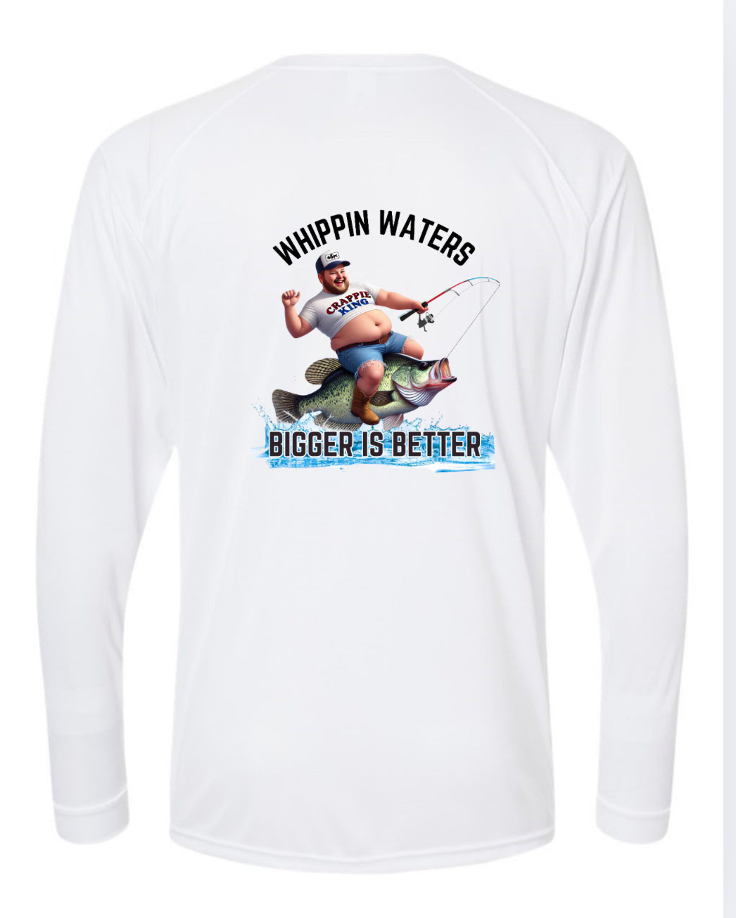 Long Sleeve Performance Polyester shirt. The shirt has graphics that are sublimated which impregnates the design into the fabric of the shirt, it will not lift, crack or dull from washing alone. These shirts provide SPF 50 and are lightweight and breathable and comfortable.