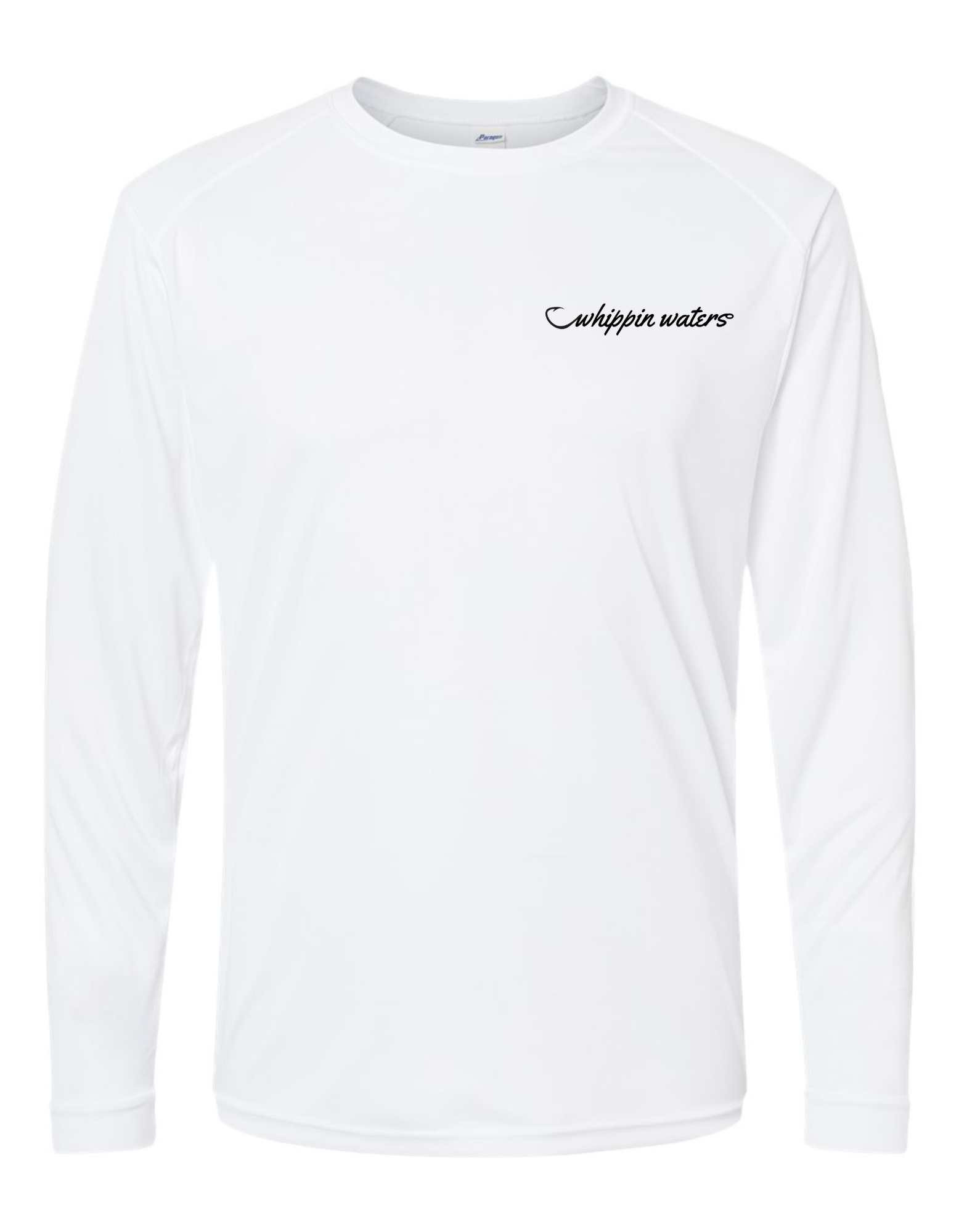 Long Sleeve Performance Polyester shirt. The shirt has graphics that are sublimated which impregnates the design into the fabric of the shirt, it will not lift, crack or dull from washing alone. These shirts provide SPF 50 and are lightweight and breathable and comfortable.